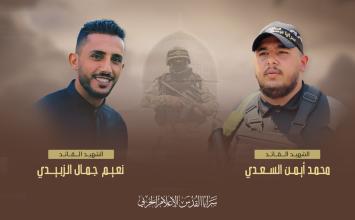 بكل فخر واعتزاز وشموخ تنعى سرايا القدس – الجناح العسكري لحركة الجهاد الإسلامي في فلسطين، اثنين من أبرز قادتها الأبطال في كتيبة جنين، الشهيد القائد محمد أيمن السعدي (26 عاماً)، والشهيد القائد "نعيم جمال الزبيدي" (27 عاماً)، اللذين ارتقيا إثر عملية اغتيال جبانة نفذتها قوات العدو الصهيوني في مخيم جنين فجر اليوم.