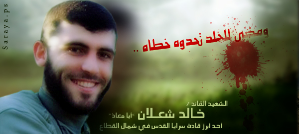وفي حديث مع عدد من قادة سرايا القدس قال القيادي في السرايا أبو انس إن الشهيد خالد شعلان " أبو معاذ " انتمى لحركة الجهاد الإسلامي منذ صغره حيث تربى في مسجد الشهداء القادة مسجد الشهيد عز الدين القسام وهو يبلغ من العمر 15 عاماً، وبدأ بالعمل التنظيمي في الحركة حتى انطلقت انتفاضة الأقصى ليلتحق بعدها ومع بداية تشكيل سرايا القدس الجناح العسكري لحركة الجهاد على يد القائد مقلد حميد ليكون اصغر عضو في سرايا القدس في تلك الفترة.