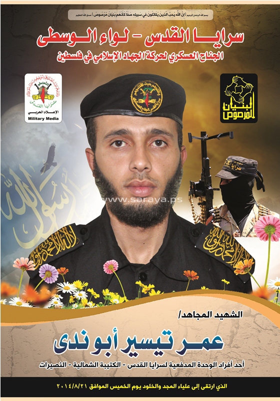 كان شهيدنا المجاهد عمر تيسير أبو ندى على موعد مع الشهادة فجر يوم الخميس 21-8-2014 م وذلك خلال تصديه للعدوان الصهيوني في معركة البنيان المرصوص, حيث خرج شهيدنا برفقة الشهيد جمعة مطر، يحملون في قلبهم قوة الإيمان والثبات والعزم على الجهاد لتنفيذ إحدى المهمات الصاروخية لدك المدن الصهيونية بوابل من الصواريخ المباركة، وبعد الانتهاء من المهمة بنجاح, تم استهدافهما من قبل طائرة استطلاع صهيونية بالقرب من أبراج النصيرات ليرتقي الشهيدين عمر أبو ندى ورفيقه الشهيد جمعة مطر إلى علياء المجد والخلود بعد رحلة جهادية طويلة معبدة بالتضحيات والبطولات والانتصارات.