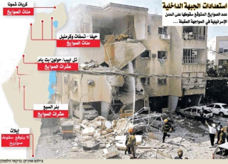 كما يعتقدون في قيادة الجبهة بأنه ستسقط العشرات من الصواريخ على مدنية تل الربيع المحتلة وحولون وبات يام وبئر السبع، وبالمقابل توقعوا في الجبهة أن مدينة ايلات لن تكون في مرمة قصف الصاروخ في الحرب المقبلة، ولذلك يستطيع سكان أن ينعموا بالهدوء هناك.