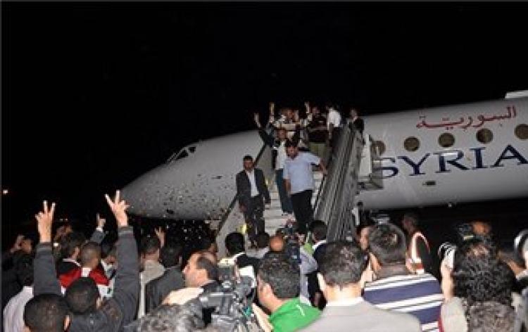 وقد وصل إلى سوريا 15 أسيرا بينهم الأسيرة أمنة منى، وكان في استقبالهم مئات اللاجئين الفلسطينيين الذين رفعوا الأعلام الفلسطينية ورددوا الهتافات المؤيدة للمقاومة.