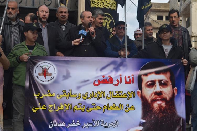 وتحدث بإسم حركة الجهاد الإسلامي عضو قيادتها في لبنان الحاج أبو سامر موسى الذي أعتبر أن الشَّيْخَ خضرَ عَدَنَانِ يخوض، مَعْرَكَتَهُ ضِدَّ السَّجَّانِ الصهيوني، وحيداً فِي زنازين الاعتقال والإرهاب والتعذيب يواجِهُ صوتُ الجلاد بِالصمَتِ الْمُطْبِقِ ، ووجبات التعذيب بالصوم عن الطعام والشراب .