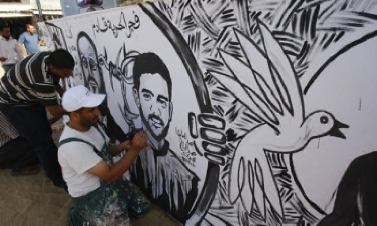 وظل بضعة فنانين يخطون رسومات باللون الأسود صوراً للسرسك والرخاوي وهما مقيدان وأخرى خلف القضبان في إشارة إلى حجم المعاناة التي يكابدها الأسيرين المضربان عن الطعان منذ أسابيع.