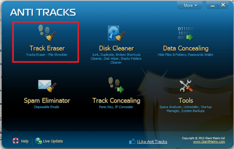 افتح البرنامج ستجد أمامك لوحة تحكم تحتوي على العديد من الخيارات إختر منها Track Eraser من اجل مسح الاثار تم بعد