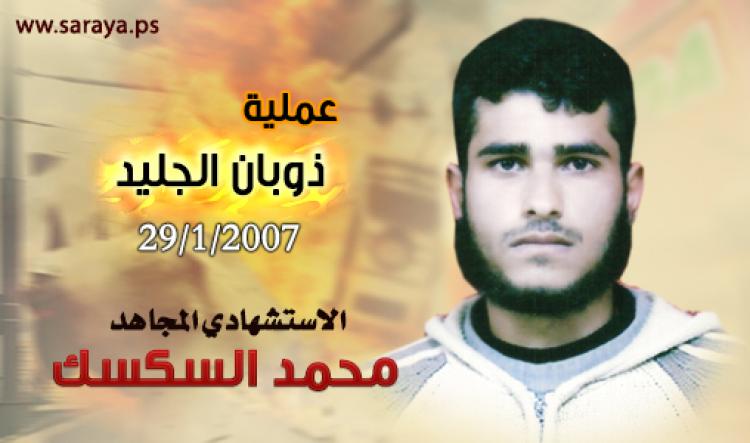 في صباح يوم السبت الموافق (27/1/2007م)، غادر شهيدنا الفارس محمد السكسك «أبو همام» منزله بعد أن ودّع والدته، وفي إطار التنسيق والتعاون المشترك بين سرايا القدس وكتائب شهداء الأقصى (جيش المؤمنين)، وخلال عملية نوعية ومعقدة توجّه الشهيد المجاهد «محمد السكسك» من سرايا القدس إلى مكان تنفيذ العملية في (مدينة أم الرشراش ـ إيلات المحتلة)، وبعد أن وصل إلى المكان يوم الإثنين الموافق (29/1/2007م) أوقف سيارة صهيونية لتقله إلى الهدف المحدد له، ويحمل حقيبة متفجرات ظهره، وما أن وصل الشهيد محمد السكسك إلى «حي إيزيدور» في مدينة إيلات المحتلة دخل أحد المخابر الصهيونية وقام بتفجير جسده الطاهر وسط جموع الصهاينة الأمر الذي أدى إلى مقتل ثلاثة صهاينة وإصابة العديد منهم بجراح متفاوتة.