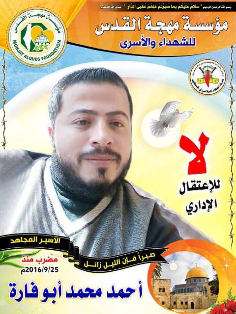 يذكر أن الأسير أحمد أبو فارة ولد بتاريخ 08/11/1987؛ وهو متزوج ومن بلدة صوريف قضاء الخليل جنوب الضفة المحتلة؛ واعتقلته قوات الاحتلال بتاريخ 02/08/2016م وحولته للاعتقال الإداري؛ وسبق أن أمضى عامين في سجون الاحتلال خلال اعتقال سابق.