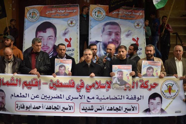 نظمت حركة الجهاد الإسلامي في فلسطين ، مساء أمس، وقفة تضامنية دعماً وإسناداً للأسرى المضربين عن الطعام والمعزولين في سجون الاحتلال الصهيوني بشكل عام، ومع الأسيرين المضربين عن الطعام أنس شديد وأحمد أبو فارة بشكل خاص.