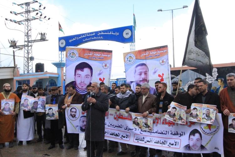 نظمت حركة الجهاد الإسلامي في فلسطين "إقليم الشمال"، ومؤسسة مهجة القدس للشهداء والأسرى، مساء الأحد وقفة تضامنية مع الأسيرين أحمد أبو فارة وأنس شديد، المضربين عن الطعام منذ سبعة وثمانون يوماً على حاجز بيت حانون، شمالي قطاع غزة، وقد شارك في الوقفة قيادة وكوادر حركة الجهاد الإسلامي بإقليم الشمال، ورفع المشاركون خلالها صور الأسيرين وشعارات تندد بسياسة الغطرسة في السجون الصهيونية.