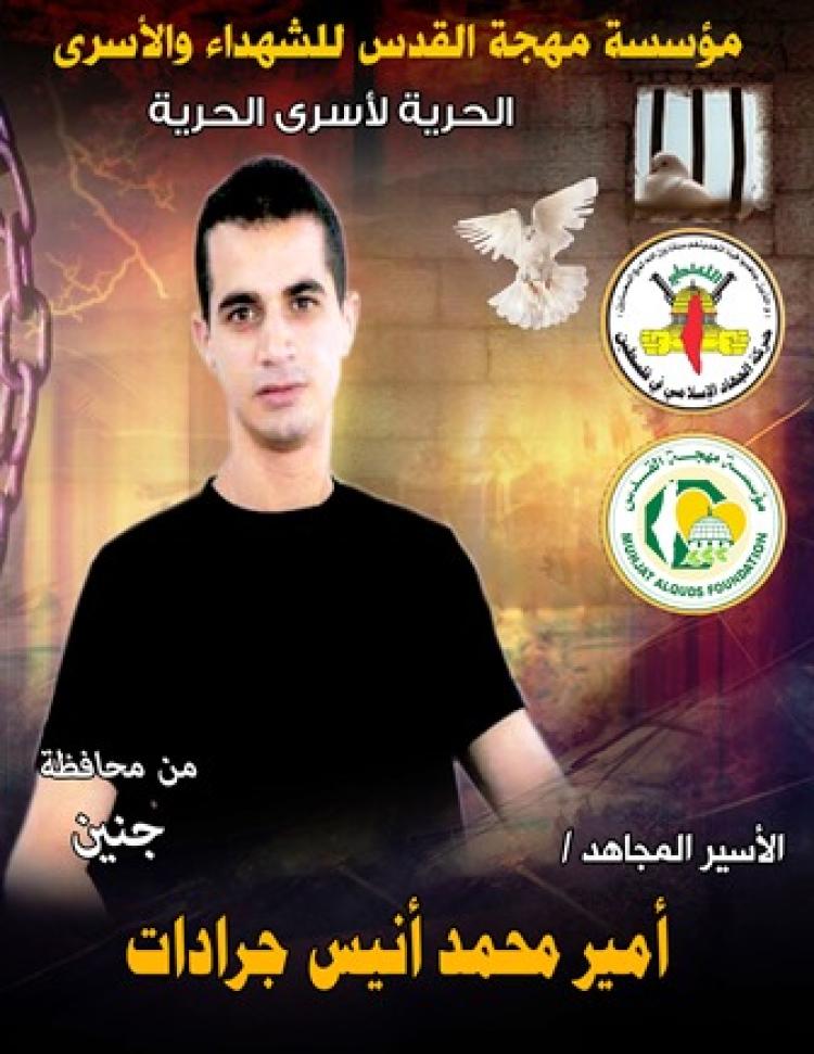 أفادت مؤسسة مهجة القدس للشهداء والأسرى، أن الأسير المجاهد أمير محمد أنيس جرادات (35)؛ من مخيم جنين شمال الضفة الغربية، قد أنهى خمسة عشر عاماً على التوالي في الأسر ويدخل اليوم عامه السادس عشر في سجون الاحتلال الصهيوني.
