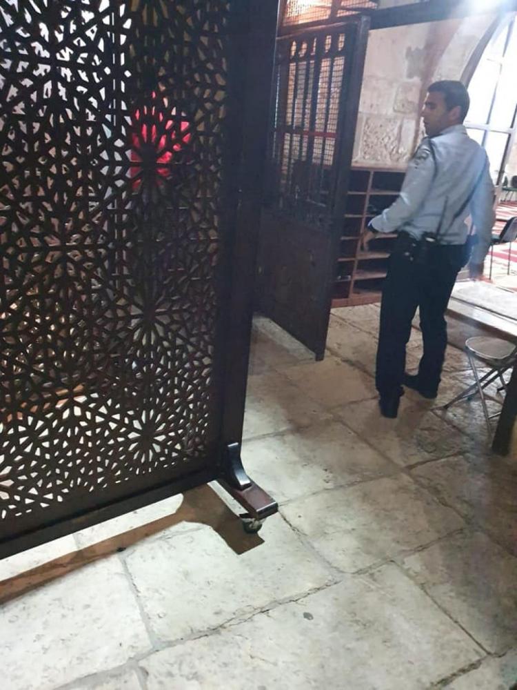 وأضاف الدبس أن شرطة الاحتلال أخرجت الأسبوع بعض محتويات مصلى "باب الرحمة"، وأعيدت مكانها داخل المصلى، محذرا من خطورة الاقتحامات المتكررة للمصلى وإخراج بعض المحتويات الضرورية منه.