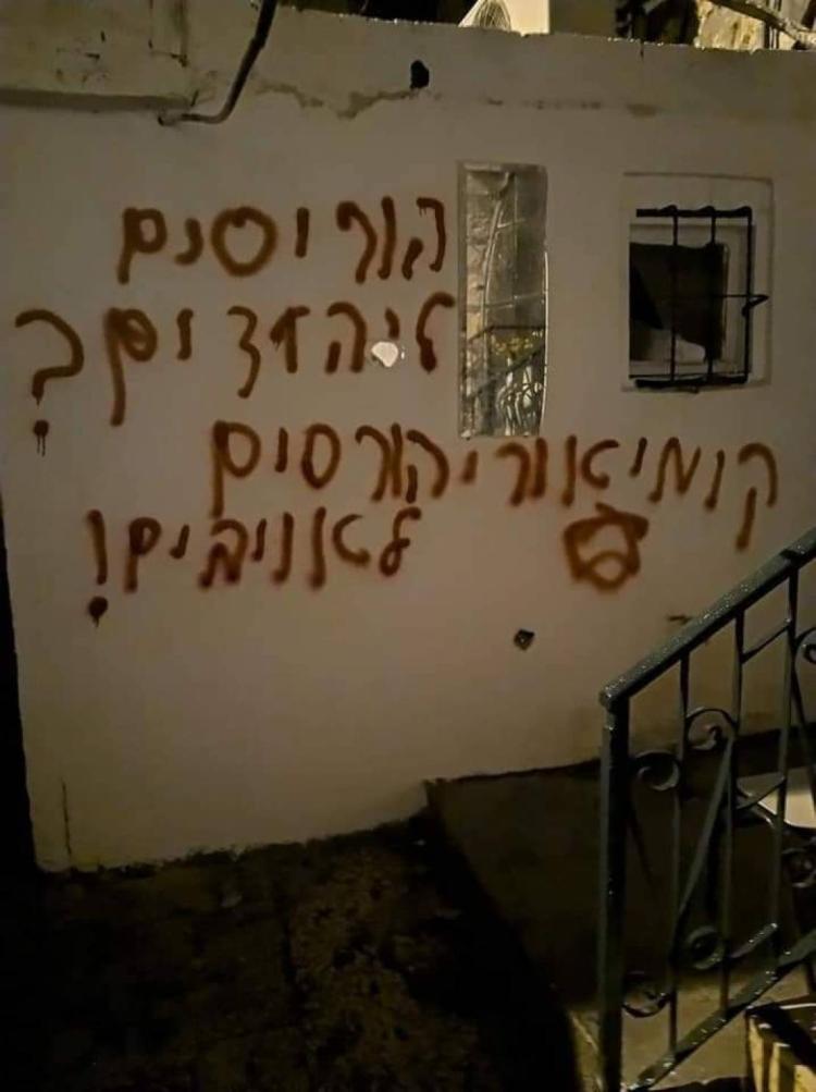 المغتصبون خطوا شعارات عنصرية على جدران المسجد وكتبوا: "يهدمون لليهود؟" وعبارة أخرى "كوري أور" في إشارة إلى بؤرة استيطانية تم إخلاء المغتصبين منها في القدس مؤخرا.