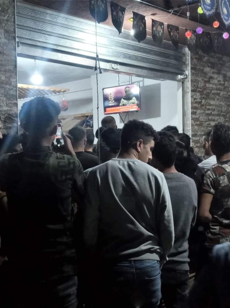 التقطت كاميرا أحد الصحافيين لمجموعة من الشباب يلتفون في أحد المحال التجارية حول شاشة تلفاز، أثناء كلمة أبو حمزة الناطق باسم سرايا القدس الجناح العسكري لحركة الجهاد الإسلامي في فلسطين.