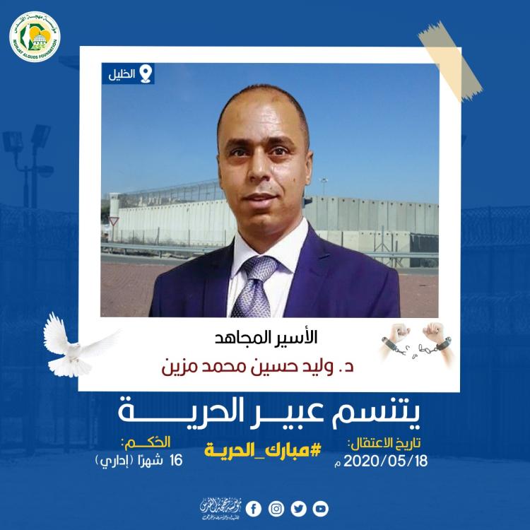 أفادت مؤسسة مهجة القدس للشهداء والأسرى والجرحى اليوم؛ أن ســلـطـات الاحتلال الصهـيـوني أفـرجـت عن الأسير الدكتور وليد حسين محمد مزين (49 عامًا)، من مخيم العروب بمحافظة الخليل جنوب الضفة المحتلة، وذلك بعد أن أمضى في الاعتقال الإداري 16 شهرًا.