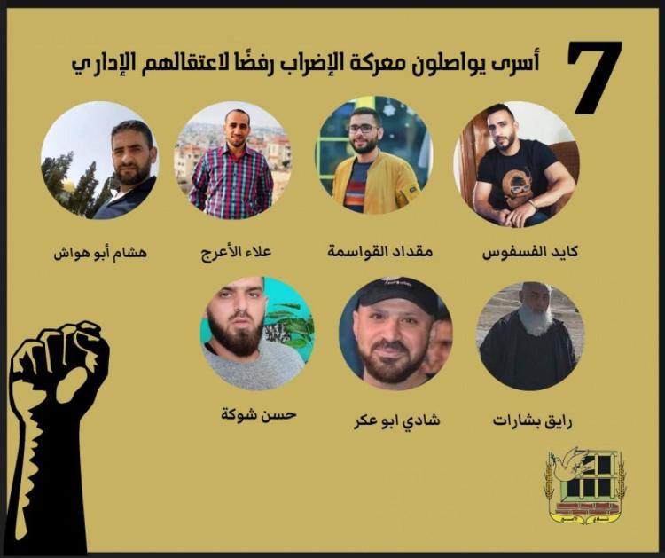 يواصل سبعة أسرى في سجون الاحتلال الصهيوني، إضرابًا مفتوحًا عن الطعام، رفضًا لاعتقالهم الإداري، أقدمهم الأسير كايد الفسفوس، المضرب منذ 80 يومًا.