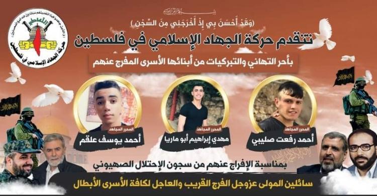 وتقدمت حركة الجهاد الإسلامي بالتهنئة والمباركة إلى عوائلهم الكريمة، داعية الله بالفرج العاجل عن باقي الأسرى والأسيرات في سجون الاحتلال.