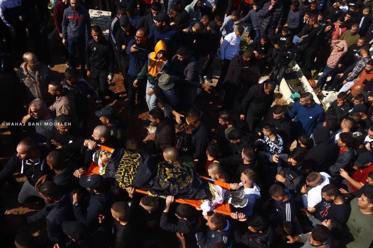 شيع أهالي مدينة جنين جثمان الشهيدين القائدين في سرايا القدس - كتيبة جنين محمد أيمن السعدي 22 عام ونعيم جمال الزبيدي 34 عام اللذان ارتقيا خلال اقتحام مخيم جنين الليلة الماضية.
