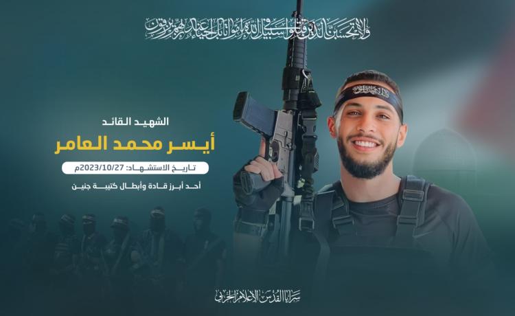 زفت سرايا القدس الجناح العسكري لحركة الجهاد الإسلامي في فلسطين، اليوم الجمعة، الشهيد القائد الميداني: "أيسر محمد العامر" أحد أبرز قادة وأبطال كتيبة جنين، الذي ارتقى فجر اليوم الجمعة أثناء قيامه بواجبه الجهادي دفاعاً عن المخيم ونصرة لغزة ضمن معركة طوفان الأقصى.