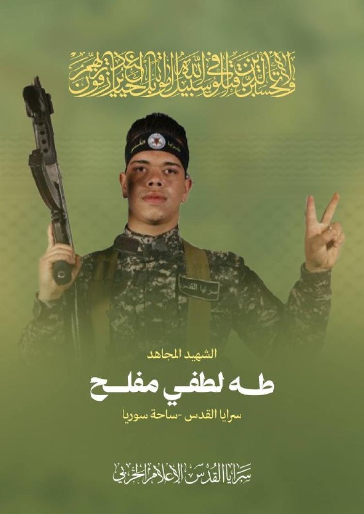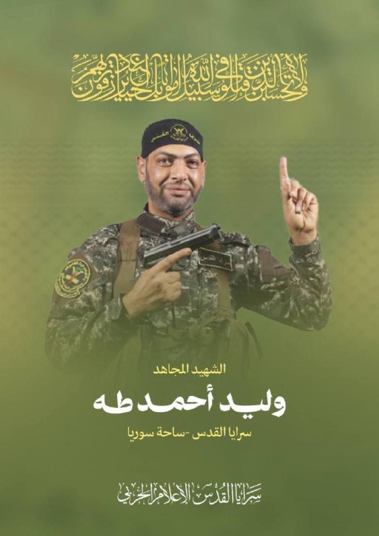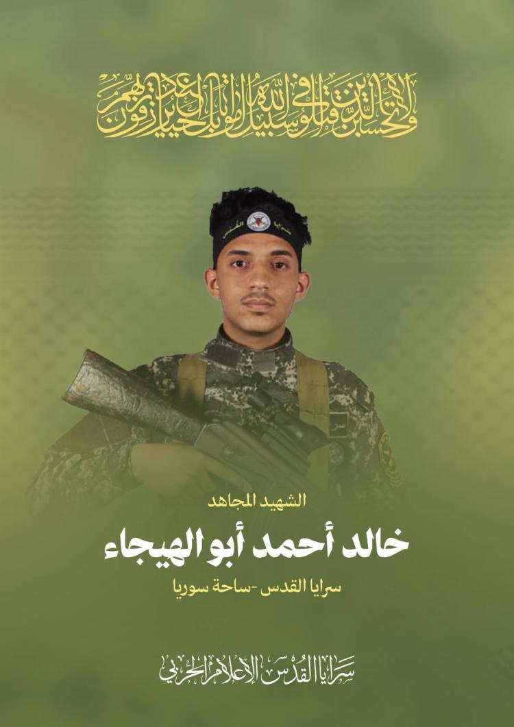 وأضافت "السرايا": "بأسمى آيات الفخر والاعتزاز تزُف سرايا القدس المجاهد وليد أحمد طه (42 عام)، والمجاهد خالد أحمد أبو الهيجاء (19 عام)، والمجاهد طه لطفي مفلح (19 عام) من أبطال كتيبة الشهيد علي الأسود – ساحة سورية.